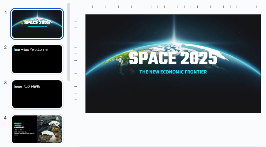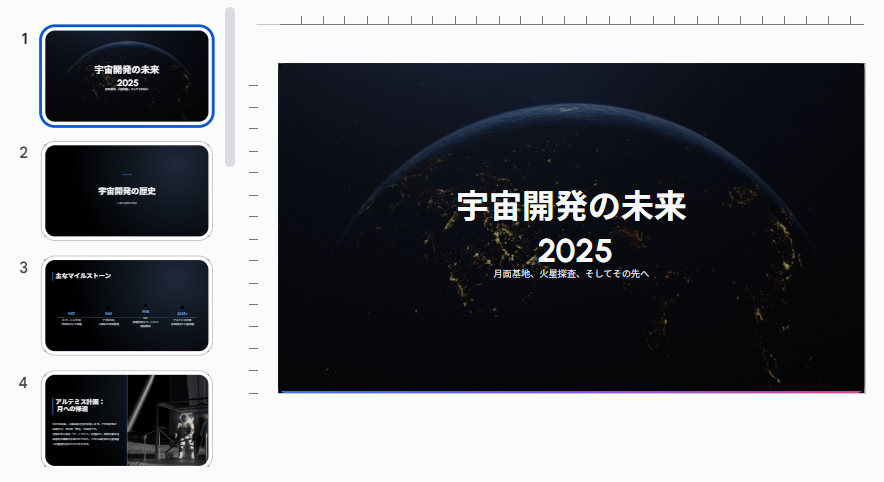 すると「宇宙開発の未来2025」という壮大なスライドが生成されました(笑)。 アルテミス計画や宇宙ビジネスなど、夢があって未来を感じますね!